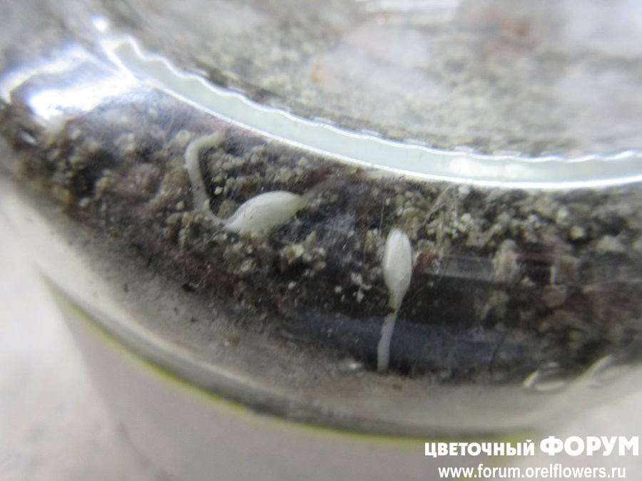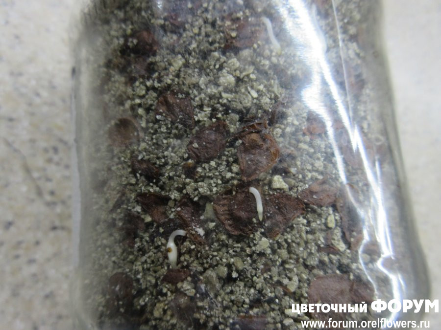Семена собрала, просушила (не нарочно так делала, просто положила и забыла)))), потом смешала с влажным вермикулитом, сложила в стеклянную банку с крышкой и оставила в тепле до появления корешков. Всё это я проделала в конце сентября. Примерно через полтора месяца я увидела сквозь стекло, что у некоторых семян появились корешки! Далеко не у всех, конечно, ведь наверняка есть и пустые, т.е. невсхожие семена, но даже то, что я вижу уже радует.
