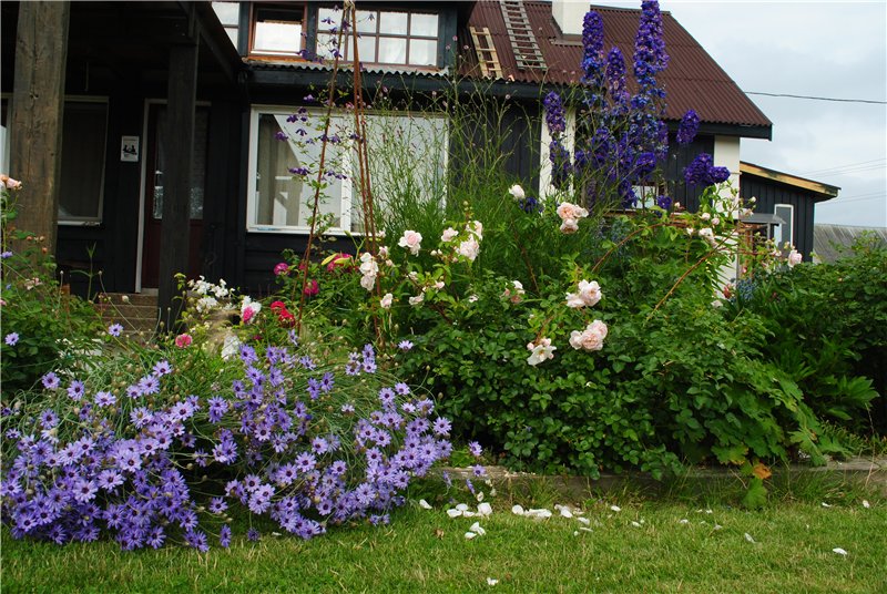 Соцветия распускаются на концах тонких, но прочных цветоносов. Цветки одновременно похожи на васильки, ромашки и цикорий, диаметр – 4 см. После окончания цветения завязываются коробочки, содержащие сотни семян. Период цветения – все лето, с мая по август, некоторые сорта – до первых морозов." Посмотрим, что получиться. А еще из синих можно васильки. Есть ведь и однолетние и многолетние виды. Например, василёк горный (Centaurea montana) – "самый известный из многолетних видов. Корневищное растение с восходящим стеблем до 80 см высотой и цельными, продолговато-ланцетными листьями серо-зеленого цвета. Краевые цветки воронковидные ярко-синие или голубые, серединные – трубчатые, пурпурные, темно-синие или фиолетово-лиловые, собранные в одиночные крупные соцветия-корзинки 5-7 см диаметром." У меня он есть, но куст сильно разваливается (требуется опора) и "разбегается". В этом году на полметра разбежался в разные стороны. Буду выкапывать и пересаживать, чтобы "собрать в кучку". Хочется такой же красивый куст, как на фото. А прямо в грунт можно посеять однолетний василёк садовый. Тоже ведь красивый.