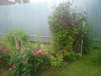 На фото гортензия слева за наперстянкой. Летом пришла идея сделать решетки,чтобы хоть немного задекорировать профнастил. Скорее всего нужен клематис подходящий к Warszawska Nike. Интересно,заказанная на весну Тучка подойдет? Или прикопанный Purpurea Plena Elegans? Как-то трудно решается задачка по выбору клематиса.