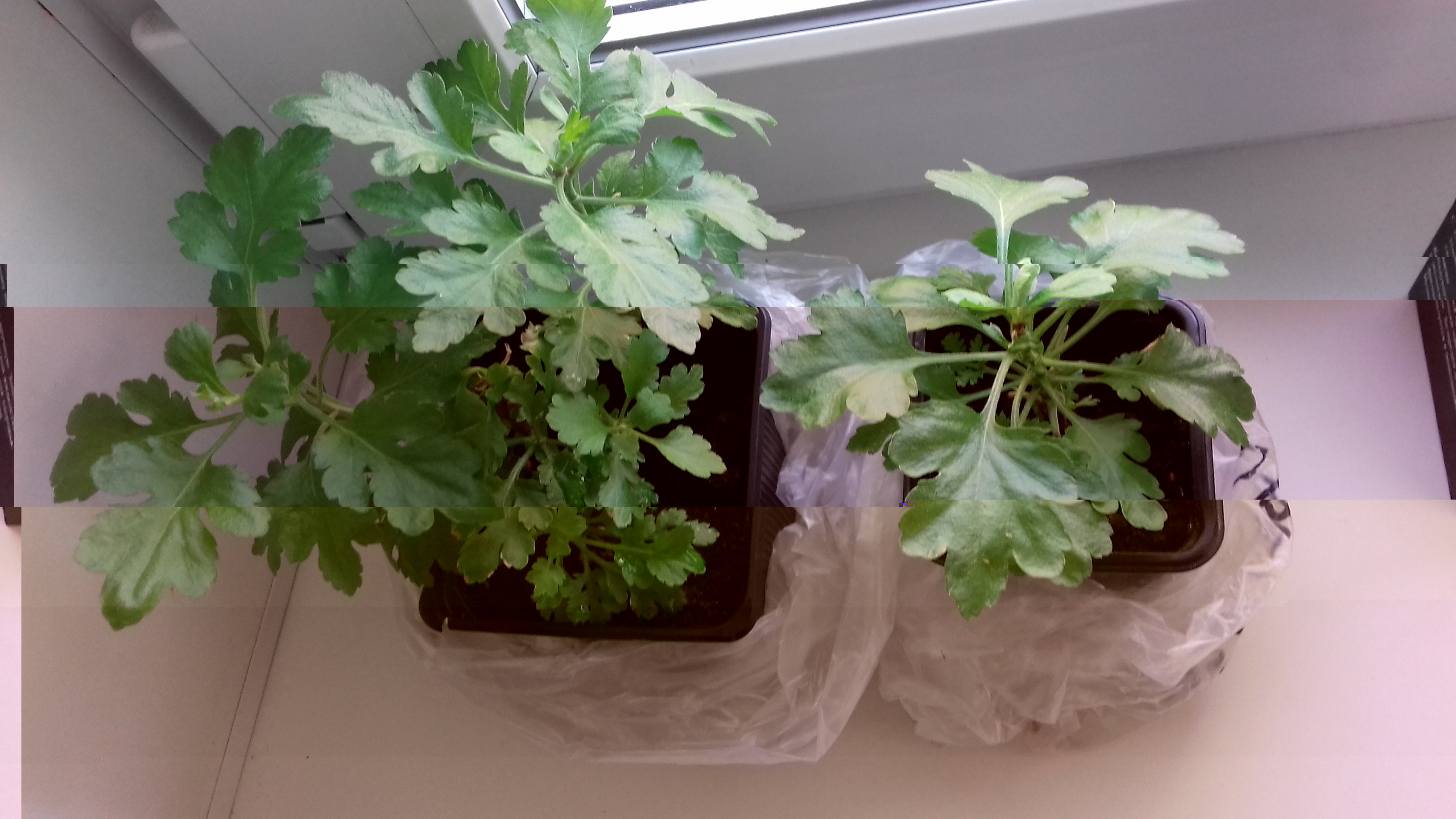 Мои хризантемки с осени стоят на окне - один сажала черенком, другой с корнями. Пока все живы, здоровы, уже прищипнула для пышности.