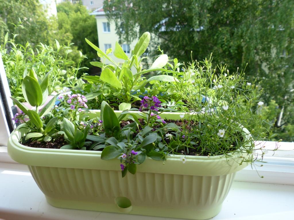 С внешней стороны моего балкона, есть выступ шириной около 9 см, на который я выставляю маленькие контейнеры. В эти контейнеры я могу посадить только низкорослые цветы и не больше 3 штук, но и такие композиции выглядят очень мило, на мой взгляд.