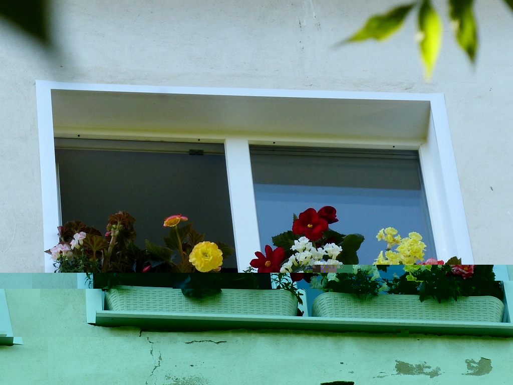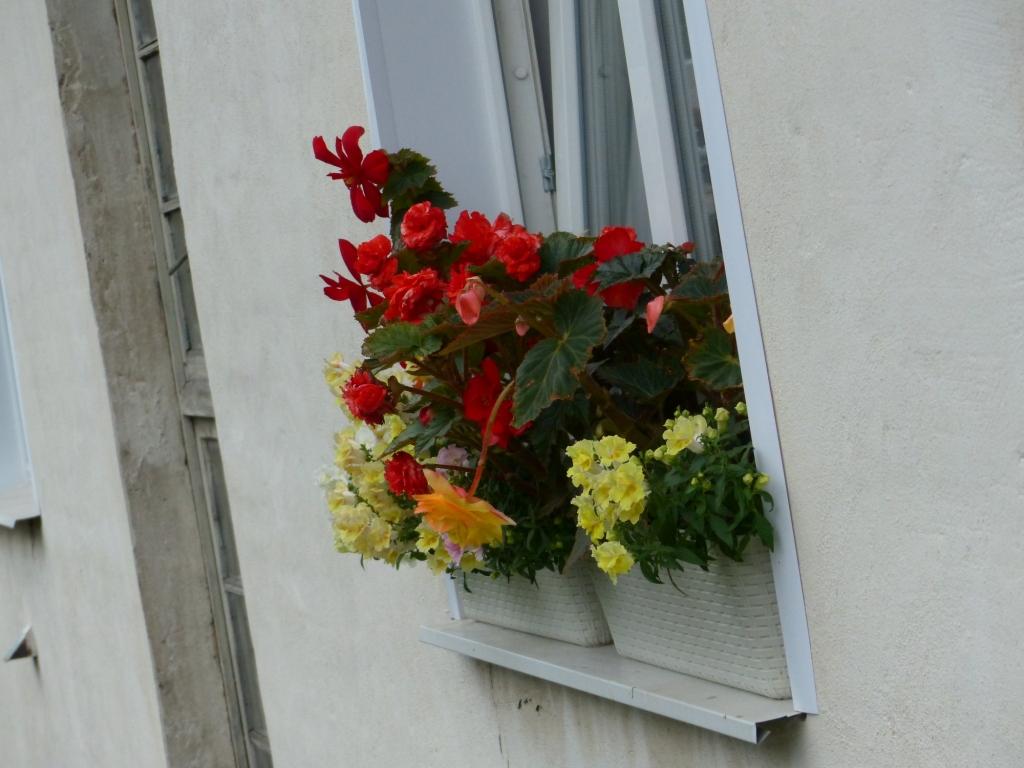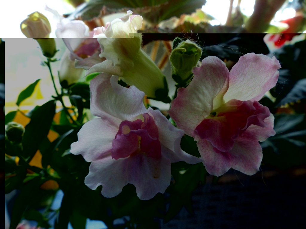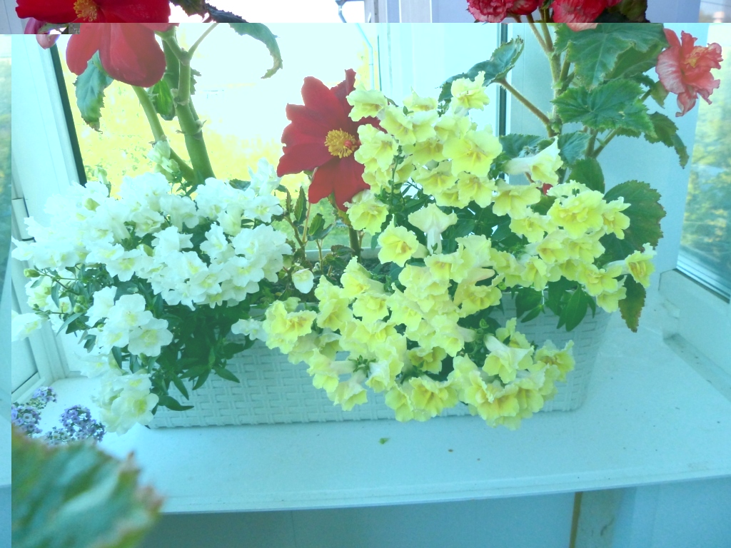 Нашла фото цветника на северном окне в красно-жёлто-белой гамме. На заднем плане клубневые бегонии, спереди львиный зев. Фото неудачные, поэтому раньше их не показывала, но теперь кажется в тему.