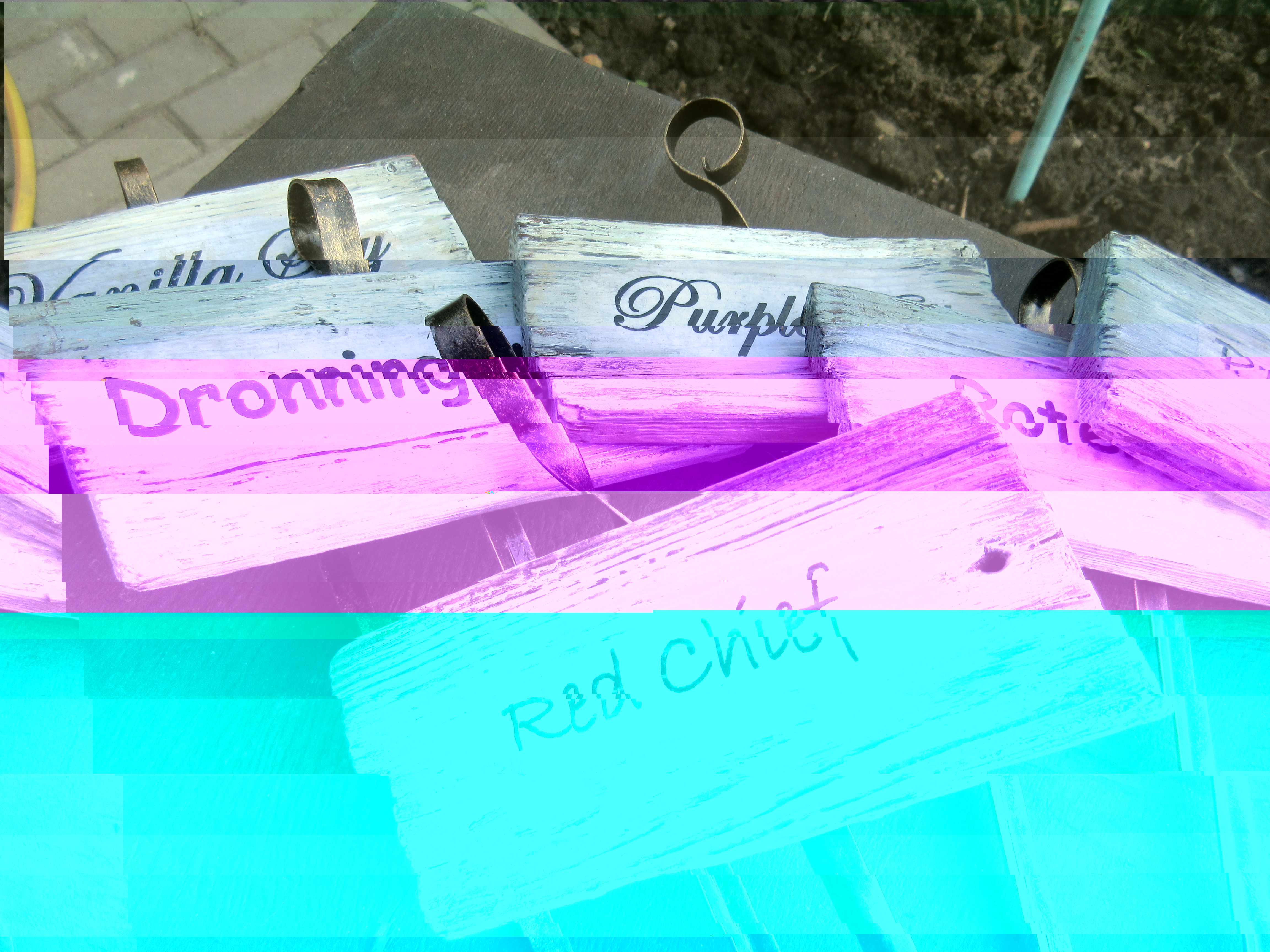 Напечатала на компьютере названия сортов, выбрав понравившийся шрифт и распечатала. Есть очень простой способ перевода картинок с бумаги на любую поверхность (почти на любую) при помощи лака. Мы уже об этом когда-то говорили. Берете бумажку с картинкой, кладете её "мордой в лак" (я использую матовый на водной основе), хорошо прижимаете и очень хорошо просушиваете. Потом размачиваете и мокрыми пальцами просто стираете бумагу. Картинка остается. Очень захватывающий процесс! Попробуйте с любой картинкой и деревяшкой и всё поймете. НО! Этот номер не пройдет с текстом, т.к. он переведётся с зада на перёд... Нужно наш текст на бумаге(в данном случае, название сорта) перед вживлением в лак зеркально перевернуть. А вот тут попросите помощи у сына. Пусть он вас или научит или просто сам перевернет. У меня пока не получается... Картинки могу перевернуть, а текст нет - не вижу нужных кнопок