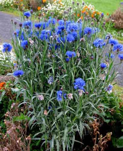 Соцветия распускаются на концах тонких, но прочных цветоносов. Цветки одновременно похожи на васильки, ромашки и цикорий, диаметр – 4 см. После окончания цветения завязываются коробочки, содержащие сотни семян. Период цветения – все лето, с мая по август, некоторые сорта – до первых морозов." Посмотрим, что получиться. А еще из синих можно васильки. Есть ведь и однолетние и многолетние виды. Например, василёк горный (Centaurea montana) – "самый известный из многолетних видов. Корневищное растение с восходящим стеблем до 80 см высотой и цельными, продолговато-ланцетными листьями серо-зеленого цвета. Краевые цветки воронковидные ярко-синие или голубые, серединные – трубчатые, пурпурные, темно-синие или фиолетово-лиловые, собранные в одиночные крупные соцветия-корзинки 5-7 см диаметром." У меня он есть, но куст сильно разваливается (требуется опора) и "разбегается". В этом году на полметра разбежался в разные стороны. Буду выкапывать и пересаживать, чтобы "собрать в кучку". Хочется такой же красивый куст, как на фото. А прямо в грунт можно посеять однолетний василёк садовый. Тоже ведь красивый.