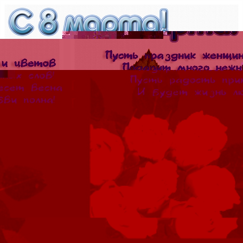 Девочки, от всей души поздравляю всех с праздником весны ДНЕМ 8 МАРТА!!! Искренне желаю всем крепкого здоровья и солнечного настроения! Пусть вашими спутниками будут удача и везение, поддержка родных и улыбки окружающих. Чтобы все всегда были любящими и любимыми, красивыми и необходимыми!!!