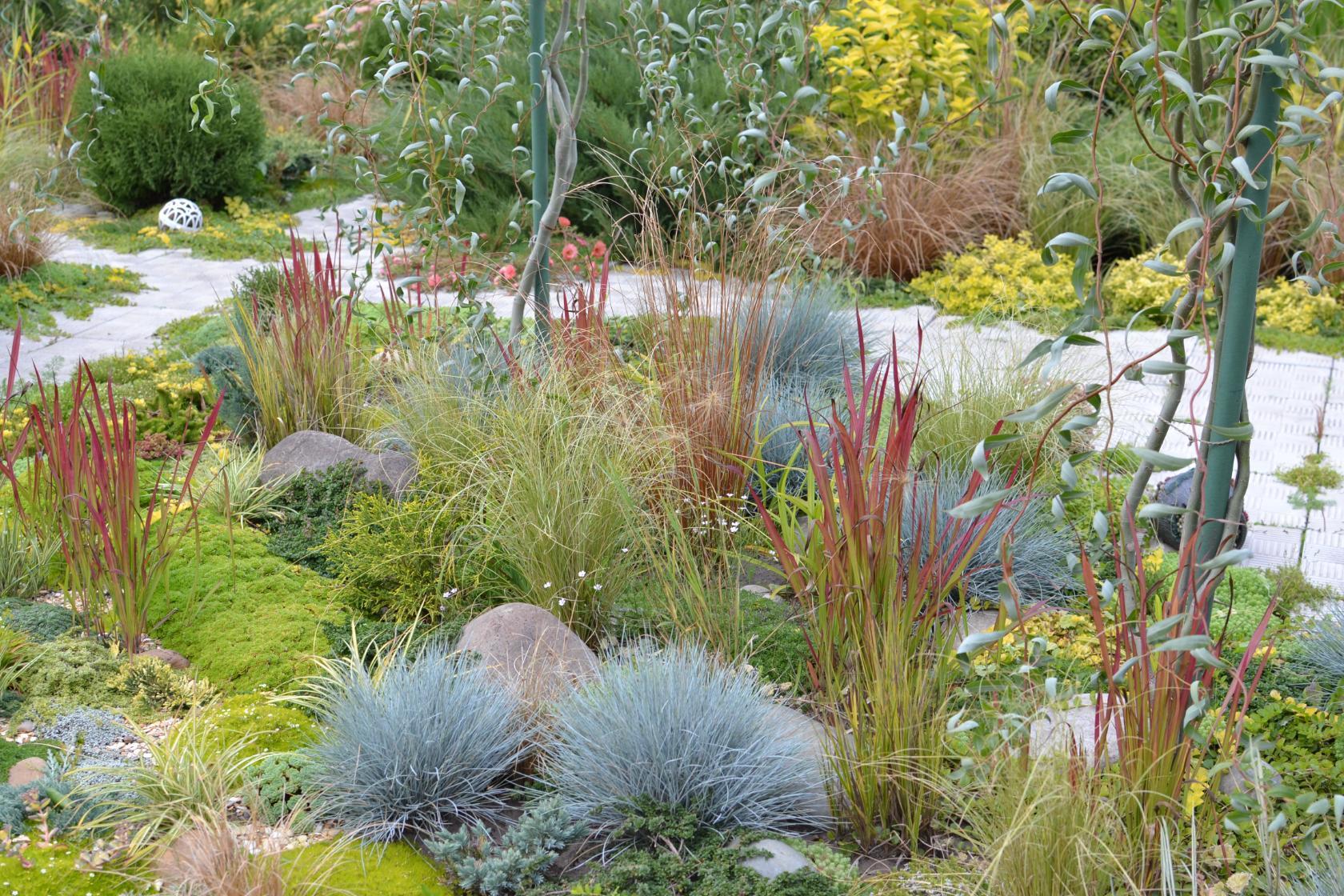 На фото очень красивая композиция со злаками. Мотаем на ус и будем пытаться весной воспроизвести нечто подобное. Я ещё где-то видела фото, на котором кустики овсяницы растут вперемежку, а точнее, в шахматном порядке с синим шалфеем дубравным. Тоже довольно красиво смотрится. Семена шалфея уже купила))) Обещают цветение в первый же год.