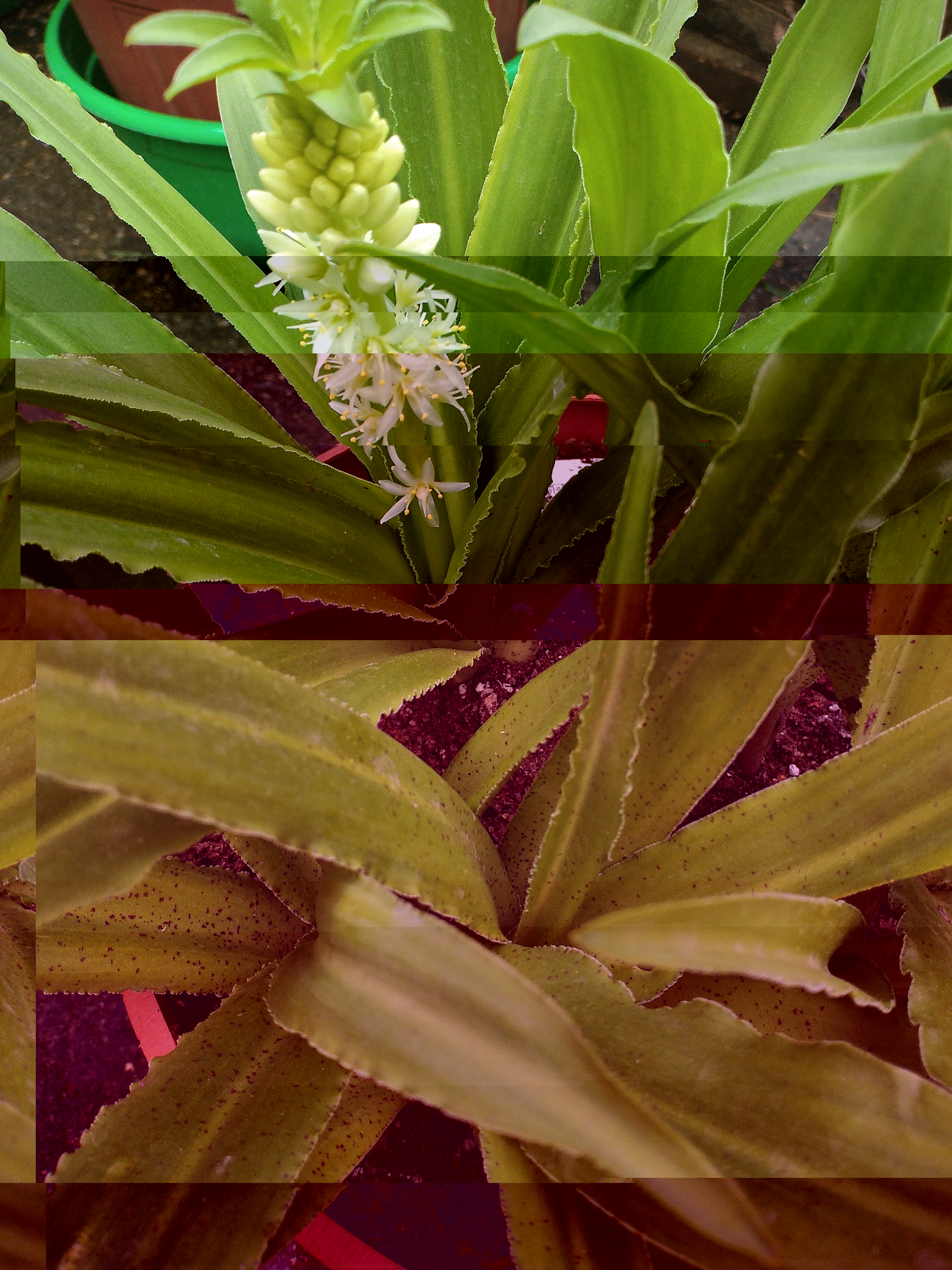 Эукомис с красивыми листьями, посадила в грунт, я решила, что на свободе он быстро нарастит луковку, а получилось наоборот, дожди не дали ему расти, хочу выкопать и посадить в горшок, но не уверена, что он хорошо перенесет пересадку.