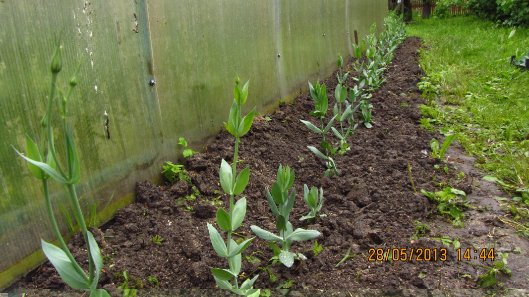 Высадила эустому вдоль теплицы.Прокопала траншею,заложила туда перегной,посыпала золой,небольшой