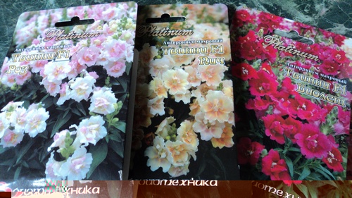 Сорта антирринума махрового (львиный зев): фирма БИОТЕХНИКА - Твинни F1 - "Виолет" (бордовый), "Роз" (розовый с белым), "Пич" (ораньжево-желтый). А белый от фирмы РУССКИЙ ОГОРОД -смесь 5 окрасок (все эти же цвета окрасок и еще белый). Поскольку смесь, названия не было. В пакетах от БИОТЕХНИКИ семян по 15 шт. Цена 45 рублей.
